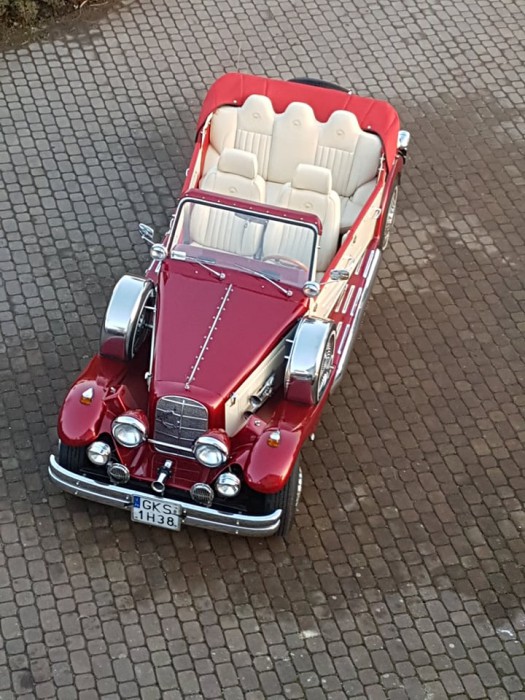 NESTOR BARON - piękne ponadczasowe pełnowymiarowe 5 osobowe cabrio z zakładanym dachem i ogrzewaniem na chłodne dni. Dach w zależności od potrzeb jest założony lub zdjęty w ciągu 2 minut. Kierowca zawsze w cylindrze fraku oraz białych rękawiczkach otwiera i zamyka drzwi MŁODEJ PARZE.